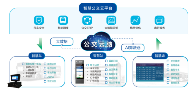 以智慧车、智慧站、智慧场为基础,以大数据和人工智能技术的公交云脑为核心,构建行车安全、智能调度、公交ERP、大数据分析、线网优化仿真、出行服务六大核心应用的智慧公交云平台,全面提升安全保障能力、运营生产效率、企业管理水平、决策分析能力和乘客出行体验。