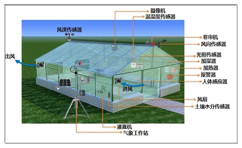根据监测光照自动控制卷帘机开关、根据土壤氮磷钾、土壤墒情监测,分析农作物生长环境、元素含量、化肥用量,根据土壤温湿度情况开启水肥一体机,节水节电。