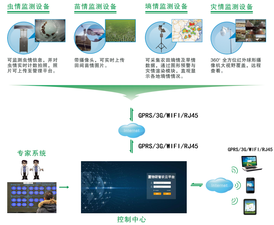 通过气象环境,遥感图像等数据信息融合、挖掘,对农作物生长趋势做出预测,并对农作物四情(墒情、苗情、虫情、灾情)进行预警分析,及时提醒用户做出预防。