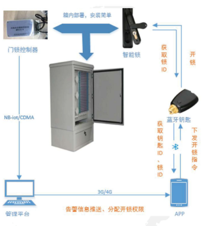 智能机柜锁由智能设备统一管控终端和机柜锁组成,该智能机柜锁通过窄带物联网通信与我公司自主研发的智能设备管控平台和APP进行通信交互,或通过对接不同协议与市场上的其他物联网平台进行对接。机柜锁锁体内置蜂鸣器,可根据现场操作发出不同的鸣响提示;设备加装了各式传感器节点,可对安装现场的环境状况等做出感知判断,也可根据不同的需求增加或替换不同的传感器,并将相关信息上报平台;设备可通过NB-IOT远程开锁和近程蓝牙开锁,省去了钥匙管理的复杂工作。