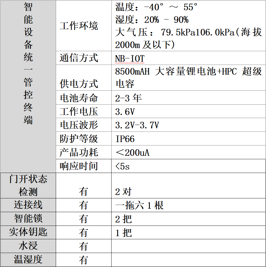 智能机柜由智能设备统一管控终端、机柜锁和传感器组成,该智能机柜锁通过窄带物联网通信与我公司自主研发的智能设备管控平台和APP进行通信交互,或通过对接不同协议与市场上的其他物联网平台进行对接。机柜锁锁体内置蜂鸣器,可根据现场操作发出不同的鸣响提示;设备加装了门磁传感器、水浸传感器、温湿度等,可对安装现场的环境状况等做出感知判断,也可根据不同的需求增加或替换不同的传感器,并将相关信息上报平台;设备可通过NB-IOT远程开锁和近程蓝牙开锁,省去了钥匙管理的复杂工作。